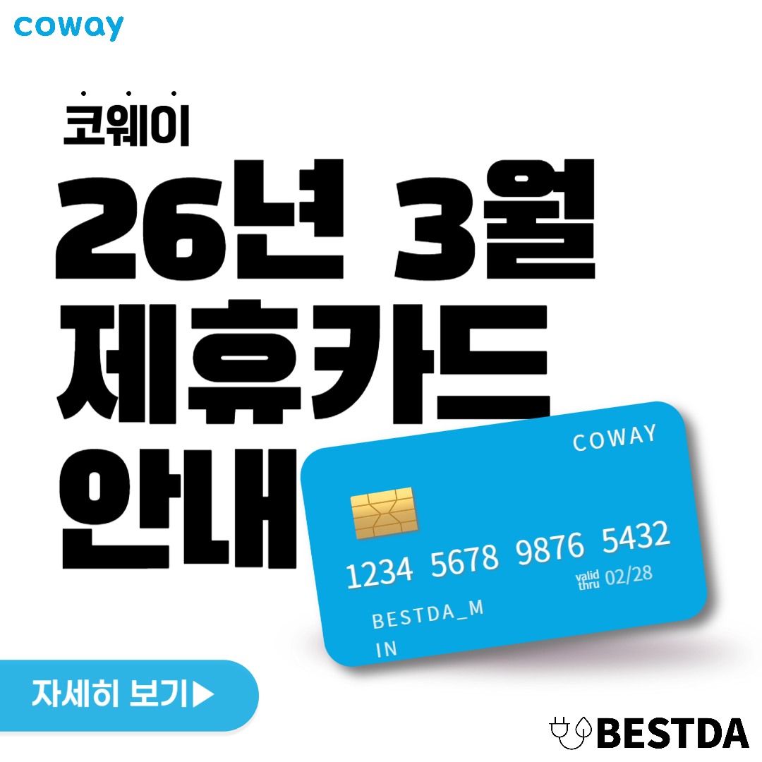 [브랜드별] 26년 3월 코웨이 제휴카드 안내 베스트다관리자 2025-05-09 10:15 94 0 이전글 다음글 검색 목록 본문 ■코웨이 제휴카드 안내1. 마음에 드는 카드를 고른다.2. 고른카드의 전용 ARS번호로 전화해서 신청한다.3. 카드 배송이 오면★★꼭★★1588-5200코웨이 고객센터에 전화해서정수기 납부방식을새로받은 카드로 변경한다.